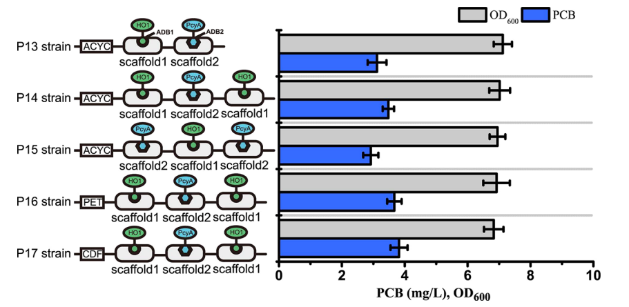 此外,在中等拷贝数的pCDFDuet-1载体中,采用DNA支架以2:1的比例实现HO1和PcyA的有效组装(图3)。