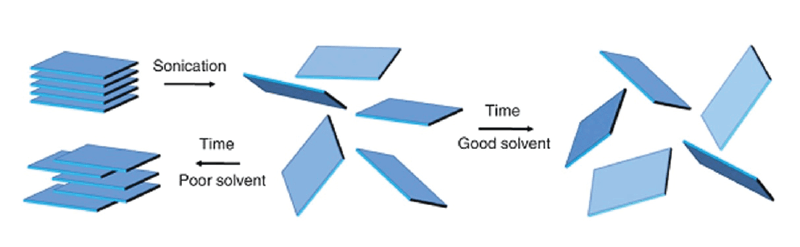 | 在不同溶剂中层状MoS 和WS 的超声剥离效果示意图 (Liquid exfoliation of layered materials. Science 340, 1226419 (2013)) |